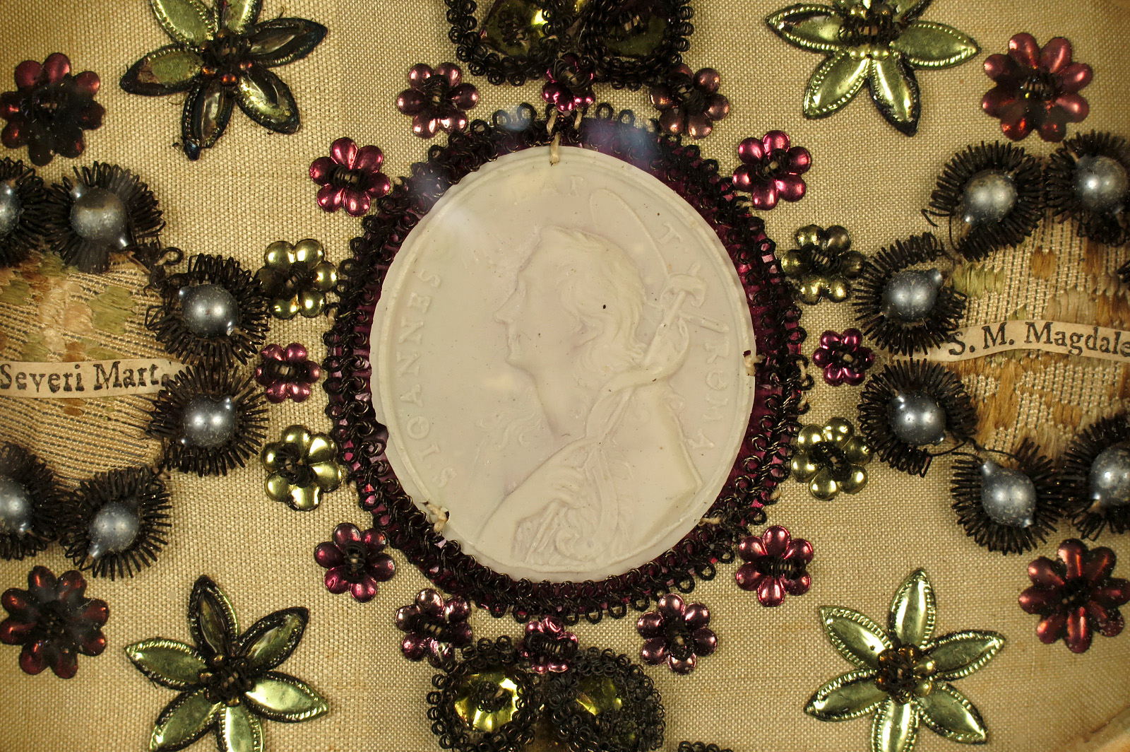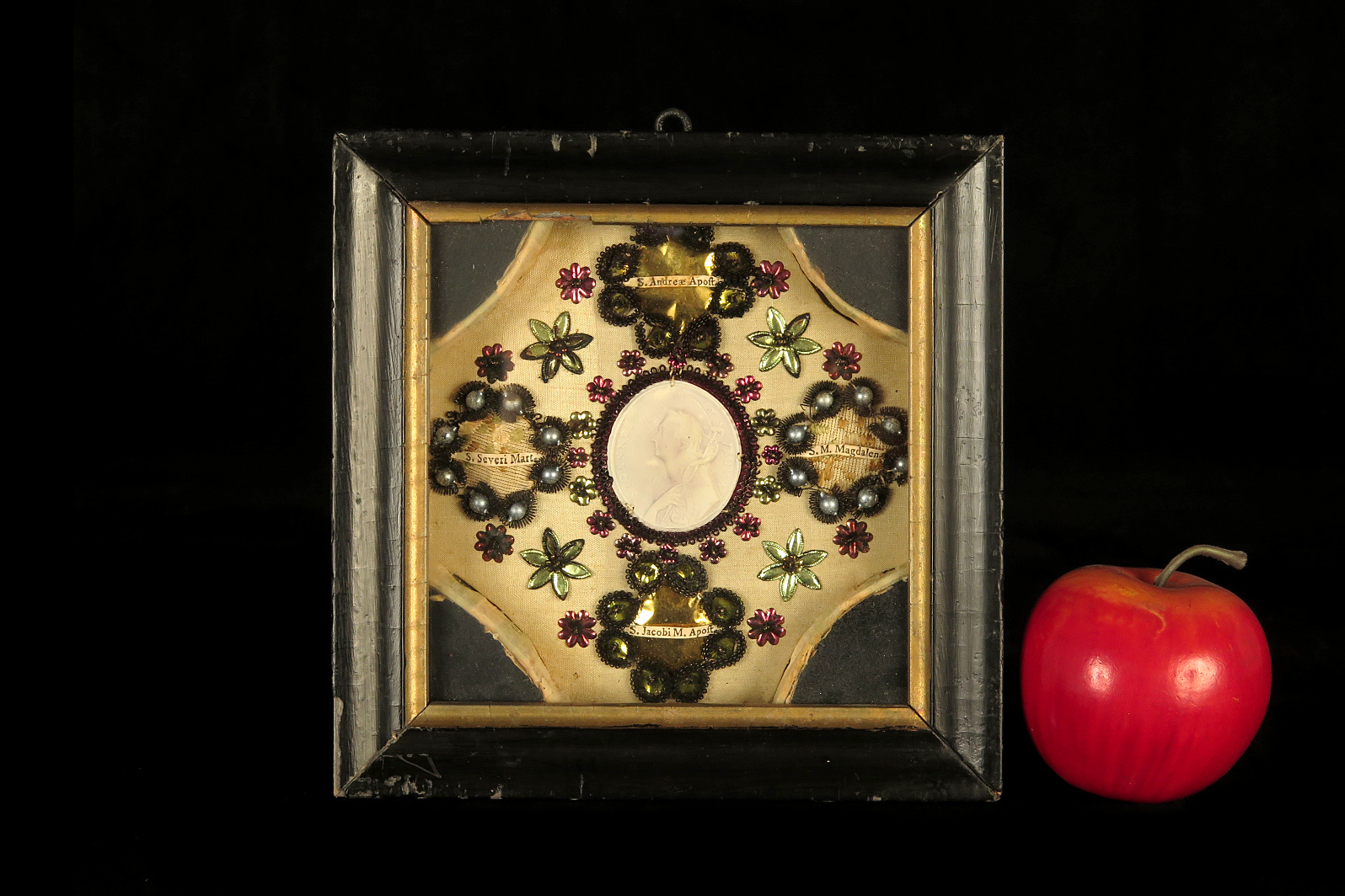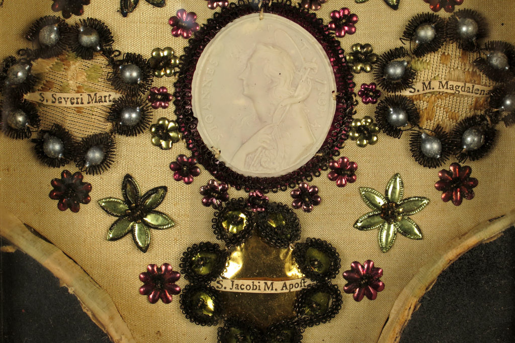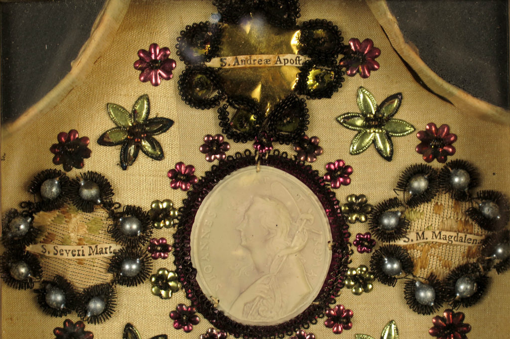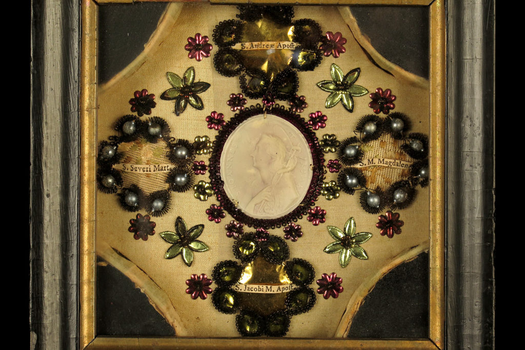 Contient quatre reliques et divers éléments décoratifs fixés sur un fond en carton bouilli tapissé.