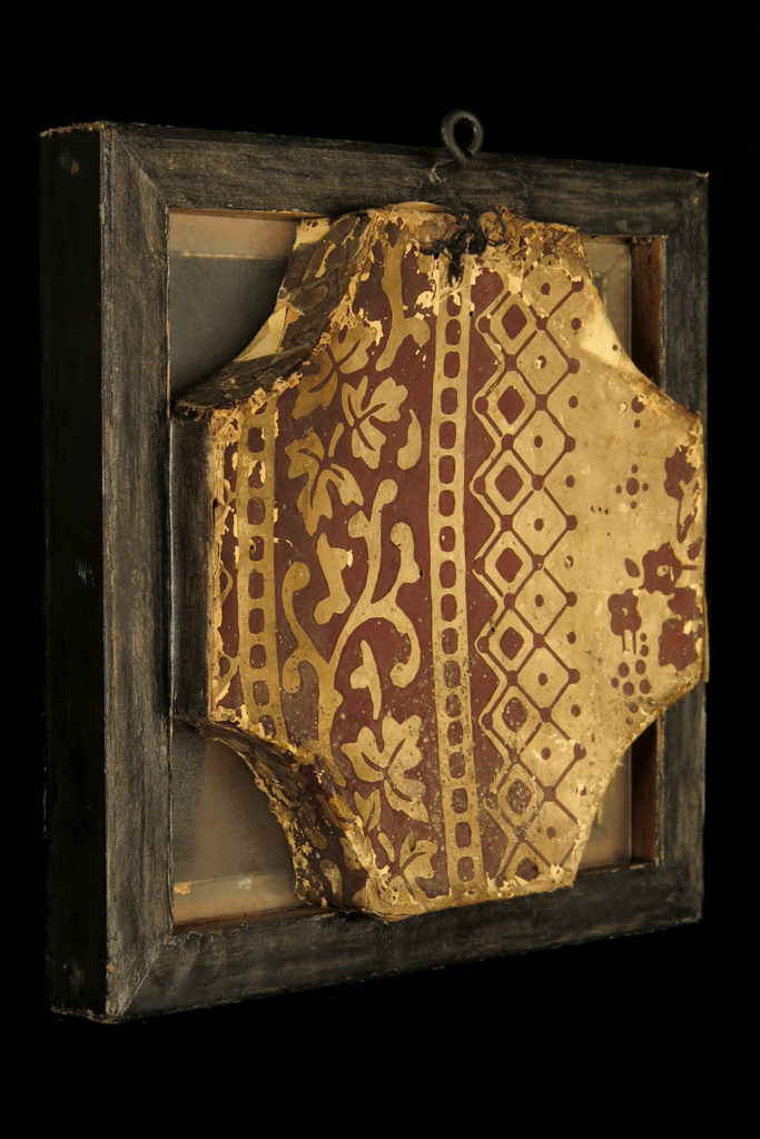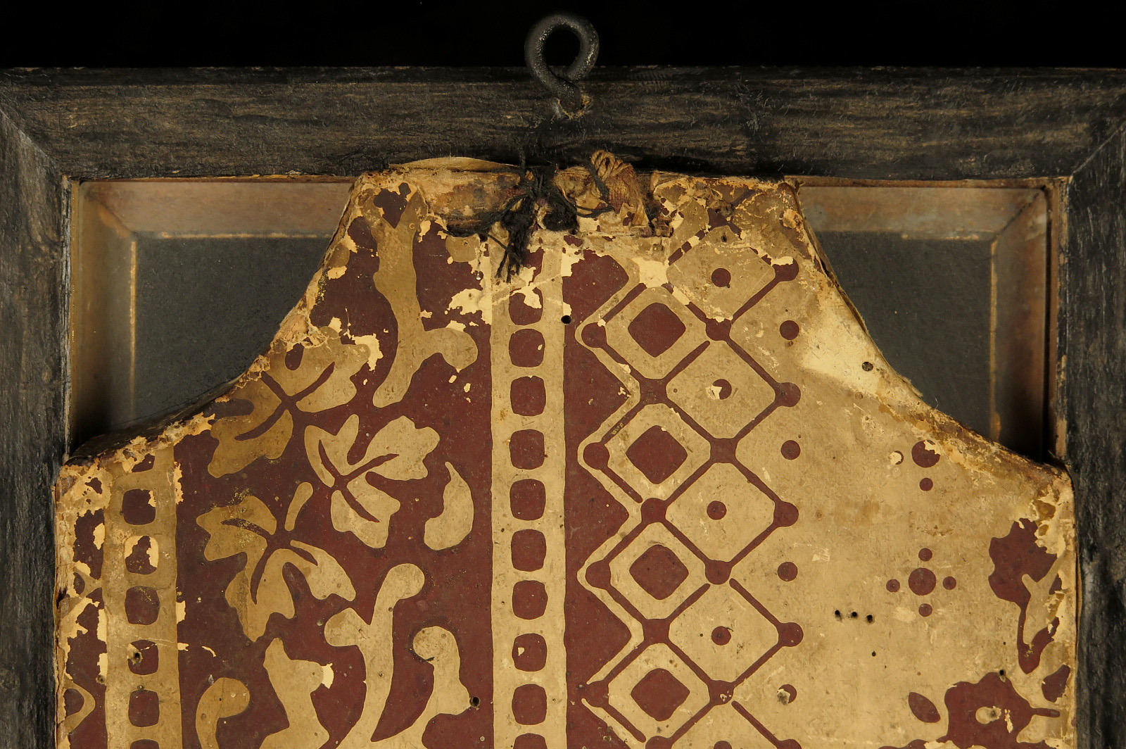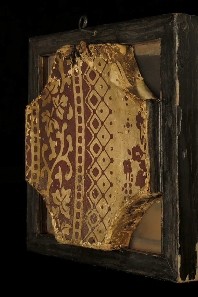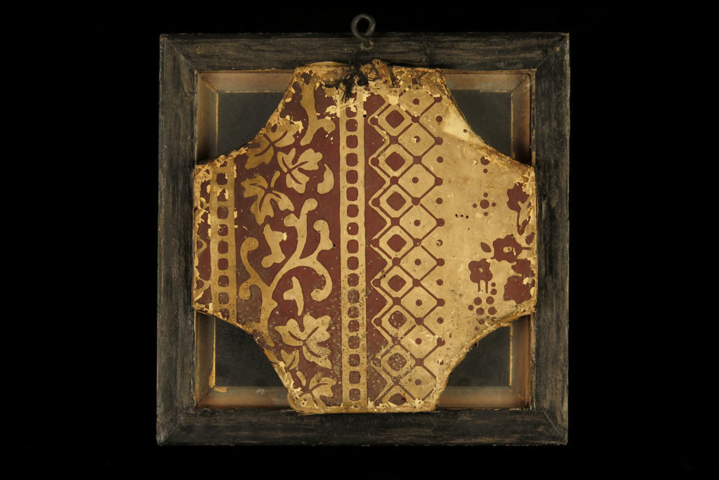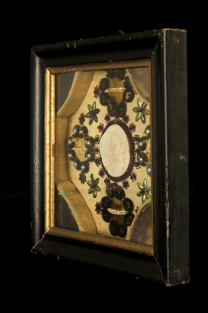 Contient quatre reliques et divers éléments décoratifs fixés sur un fond en carton bouilli tapissé.