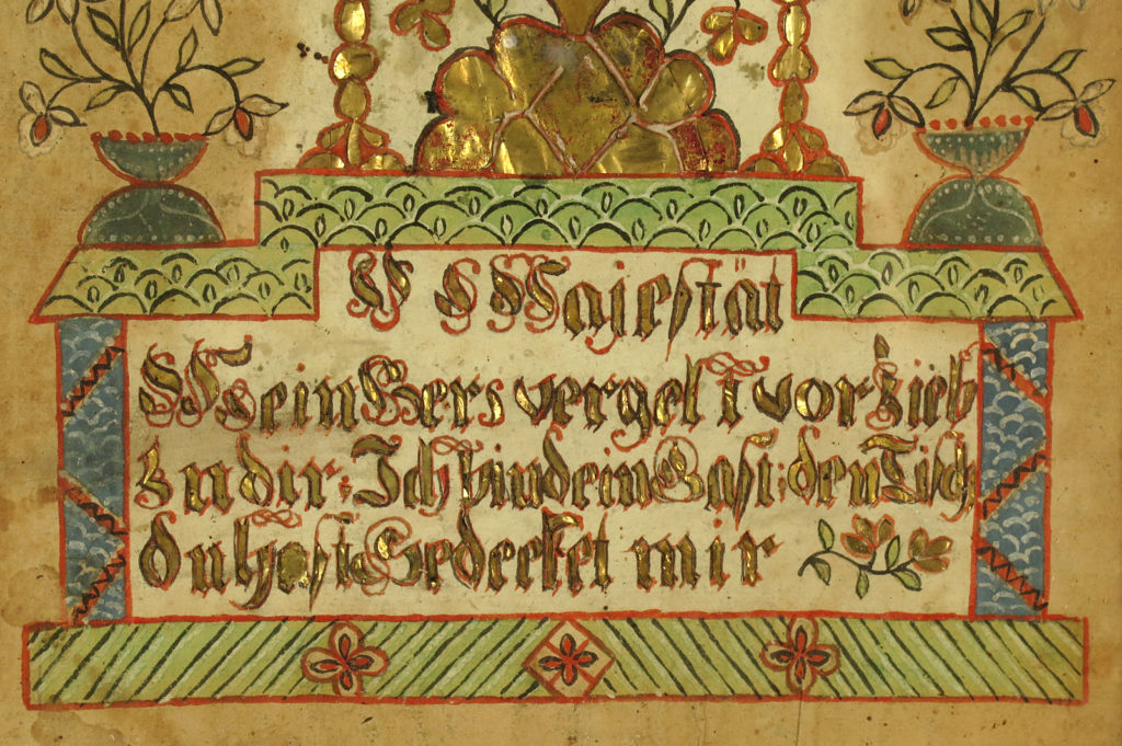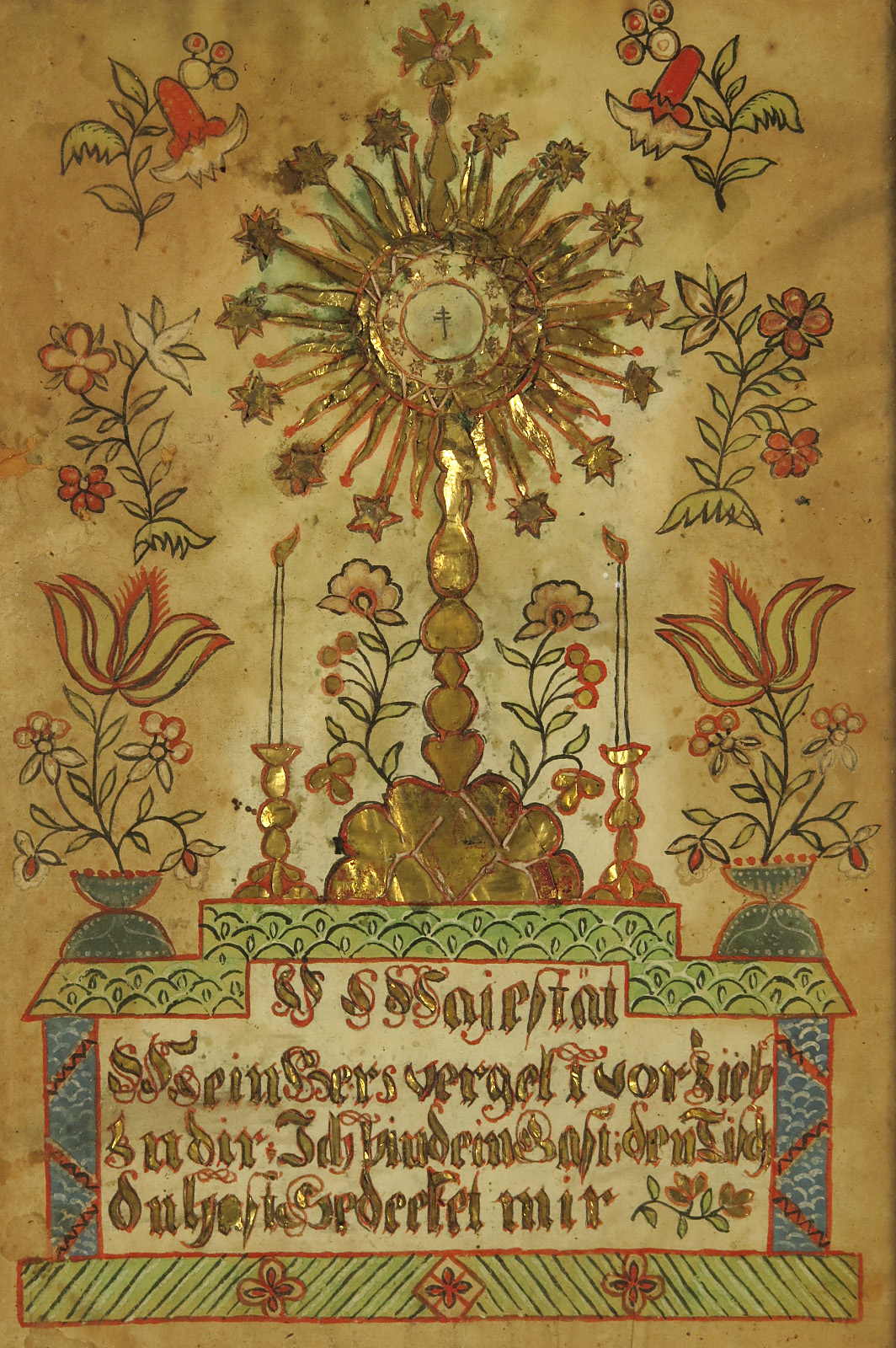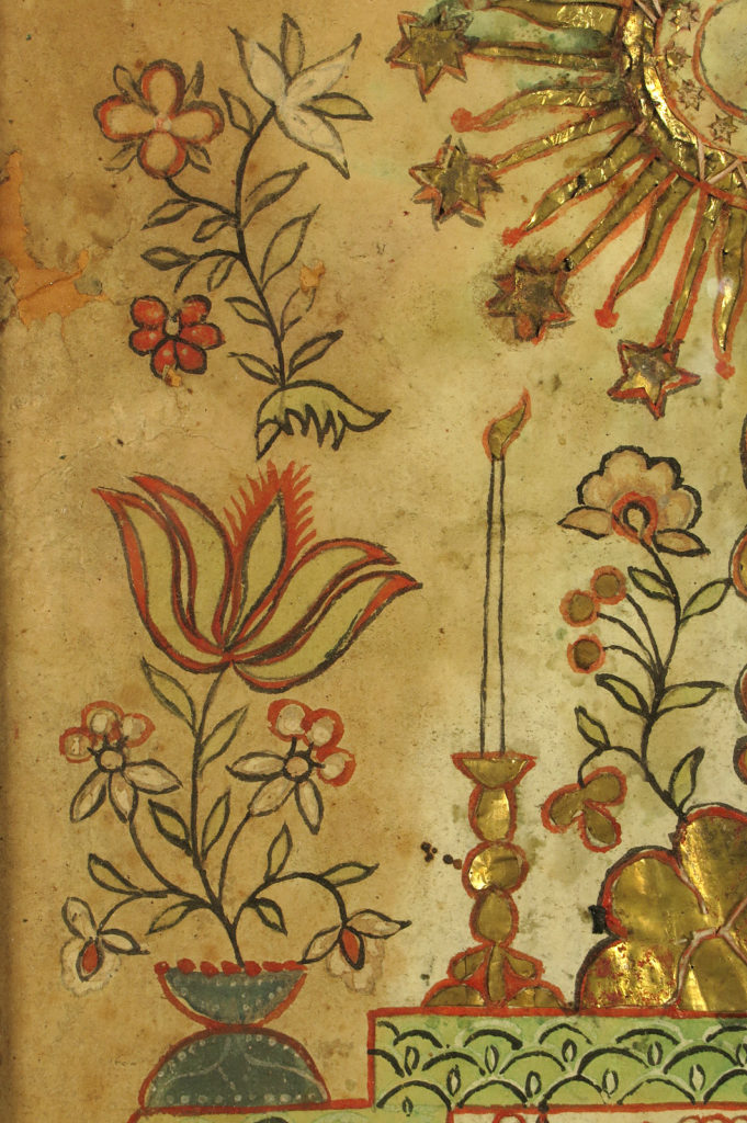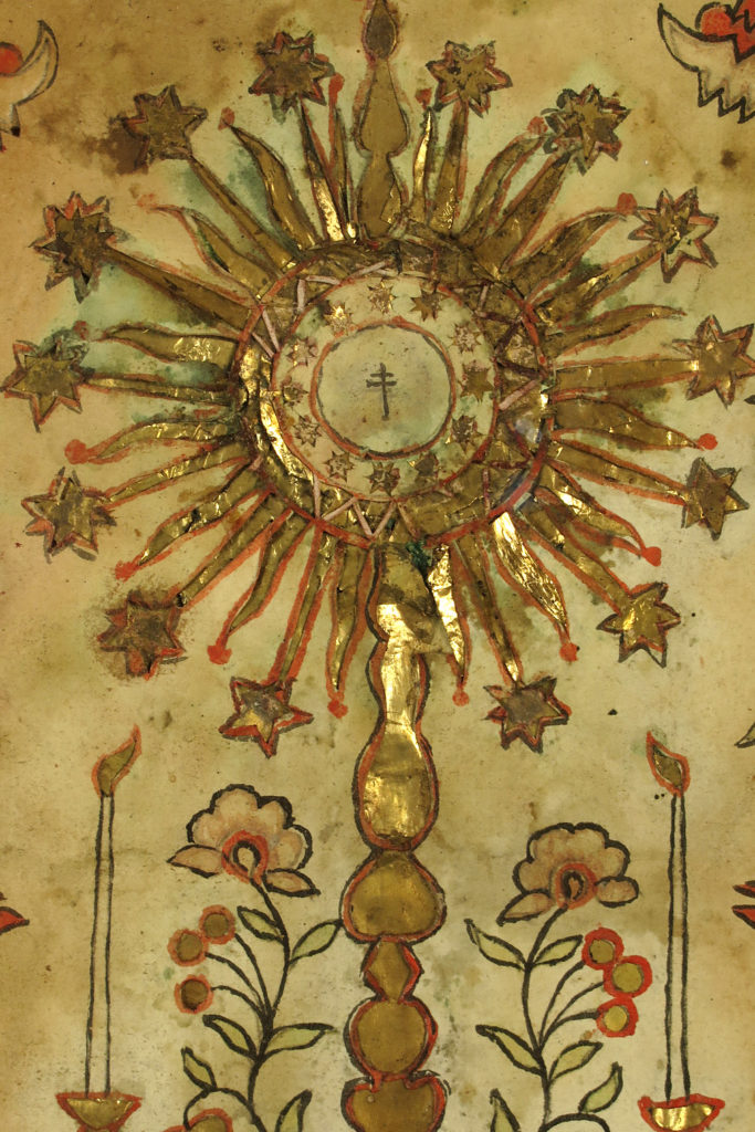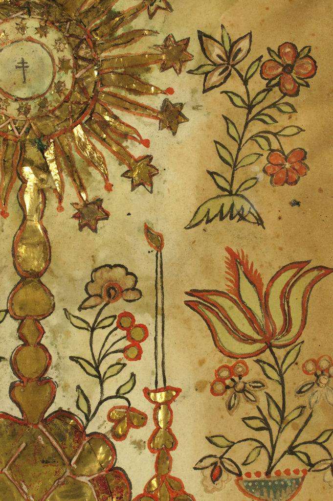 Réalisé principalement en papier découpé et peint de divers éléments d’autel et de fleurs.