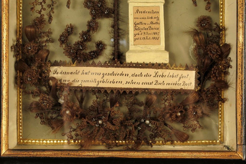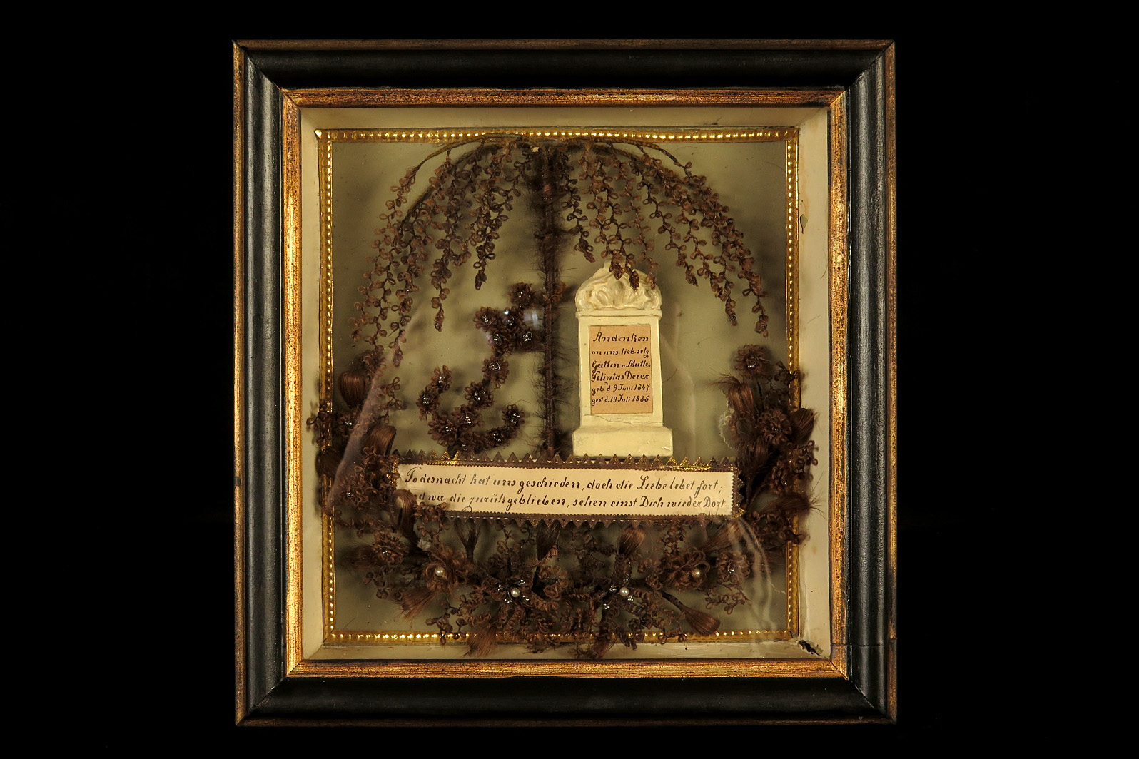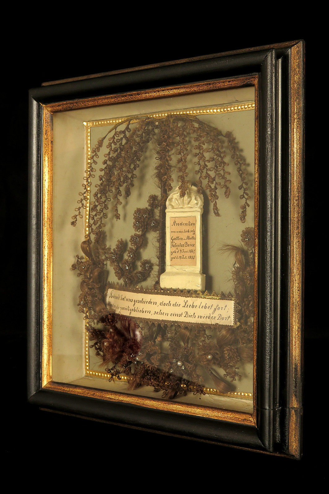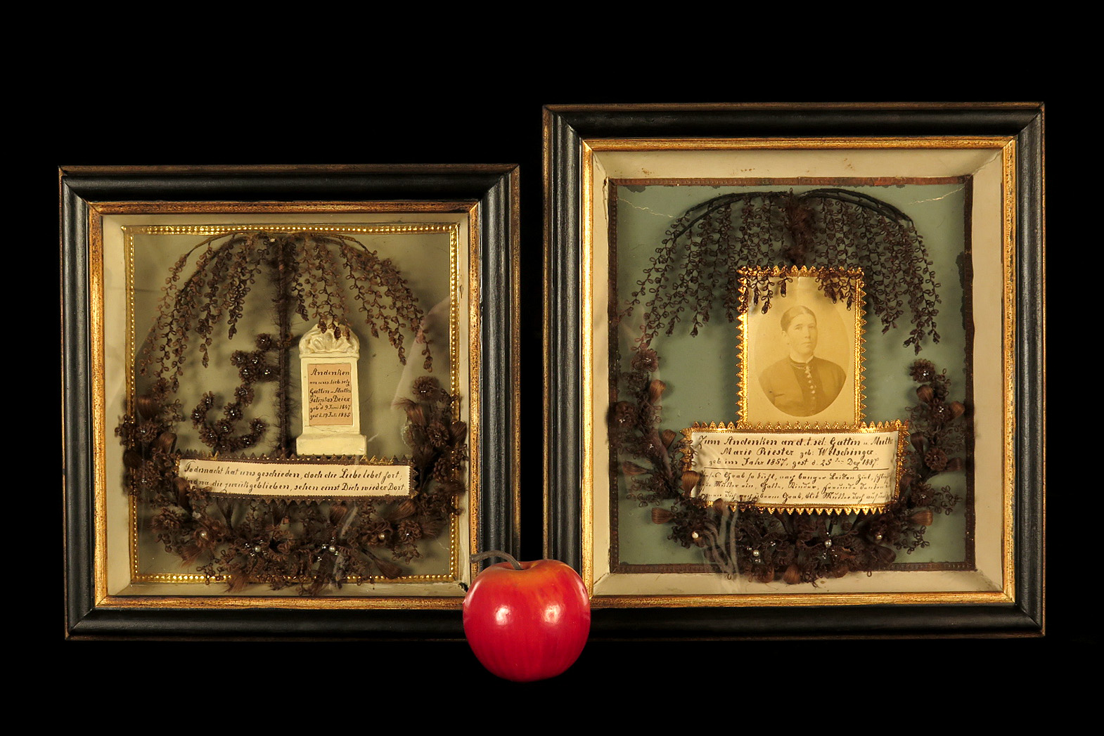 Lot de deux anciens cadres à cheveux, souvenir mortuaire vers 1880.
