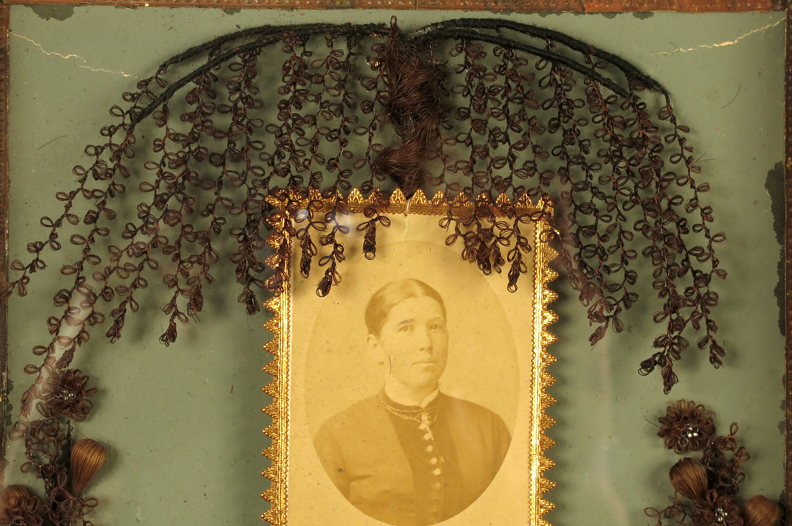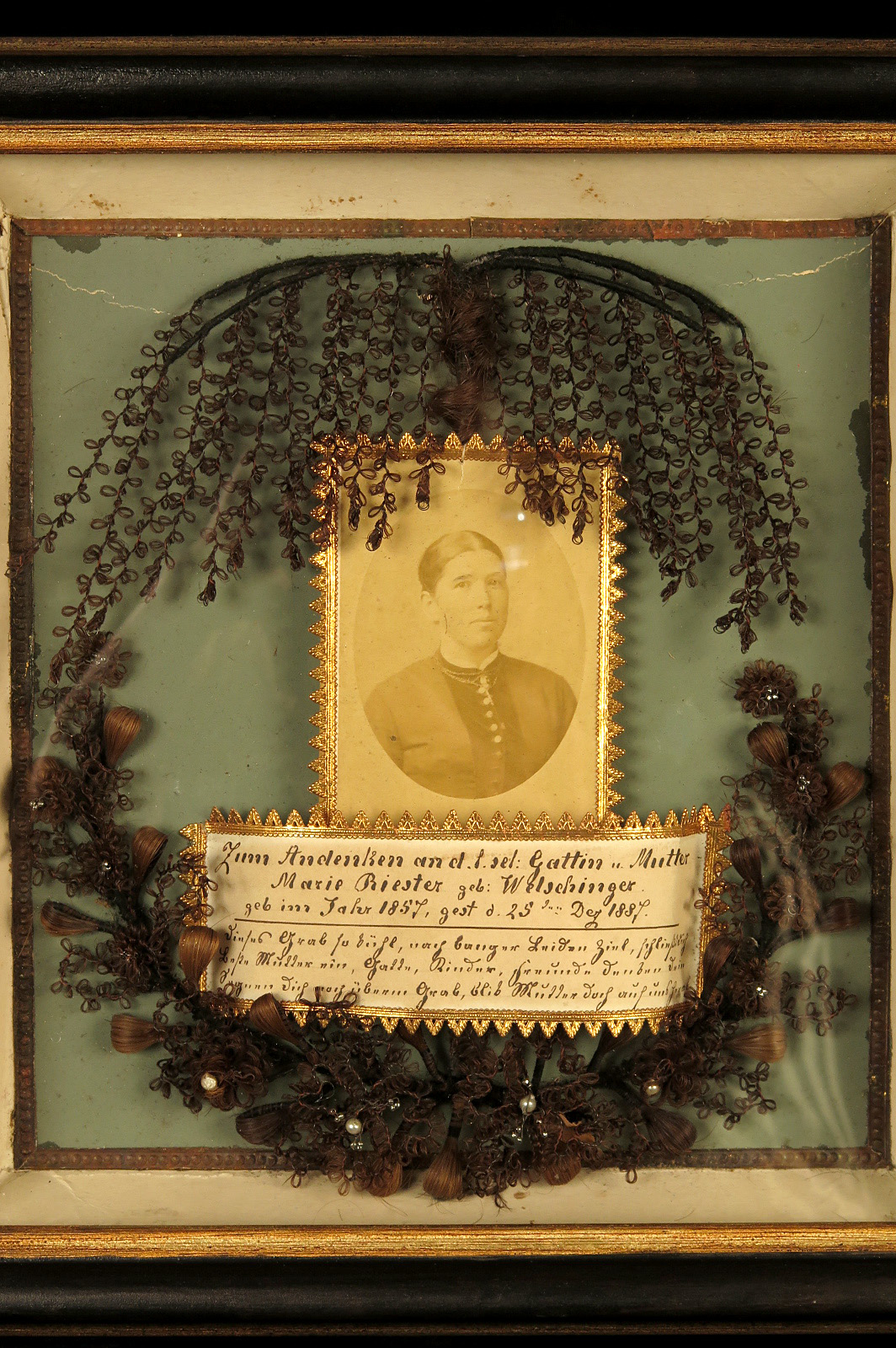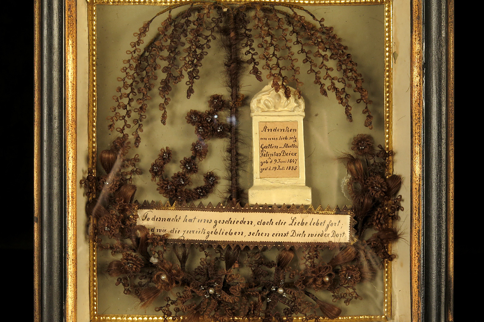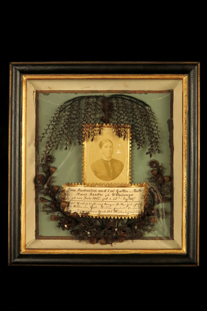 Lot de deux anciens cadres à cheveux, souvenir mortuaire vers 1880.